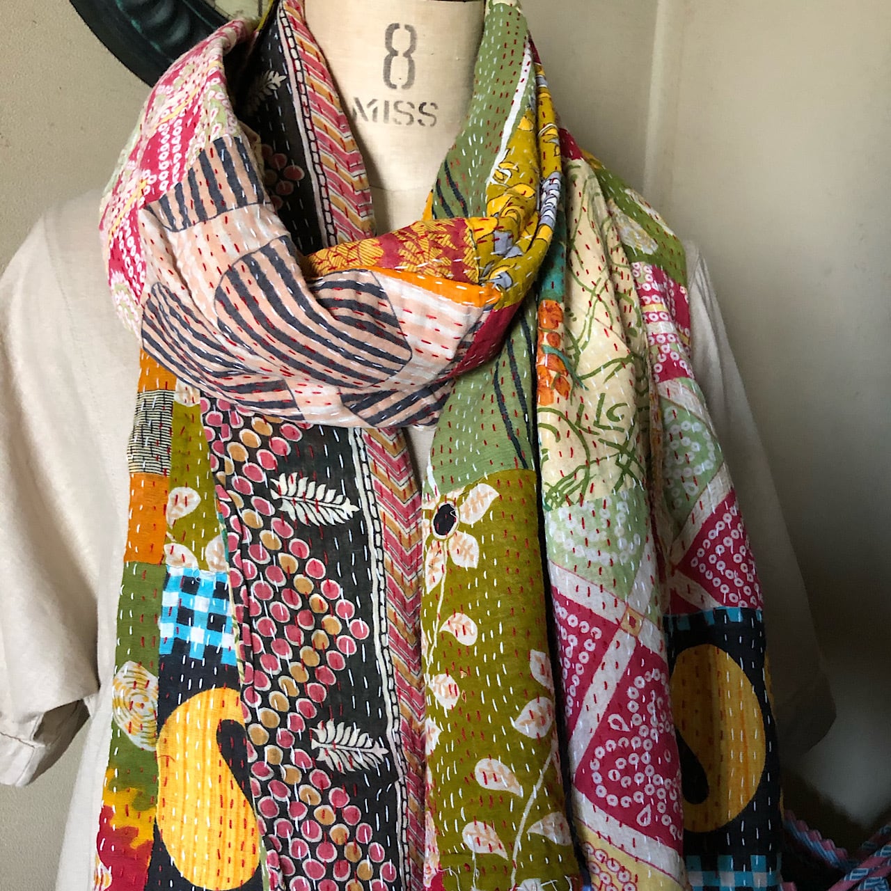 コットンのオールドサリーをパッチワークでつなぎ、チクチクと並縫いしたショールです。